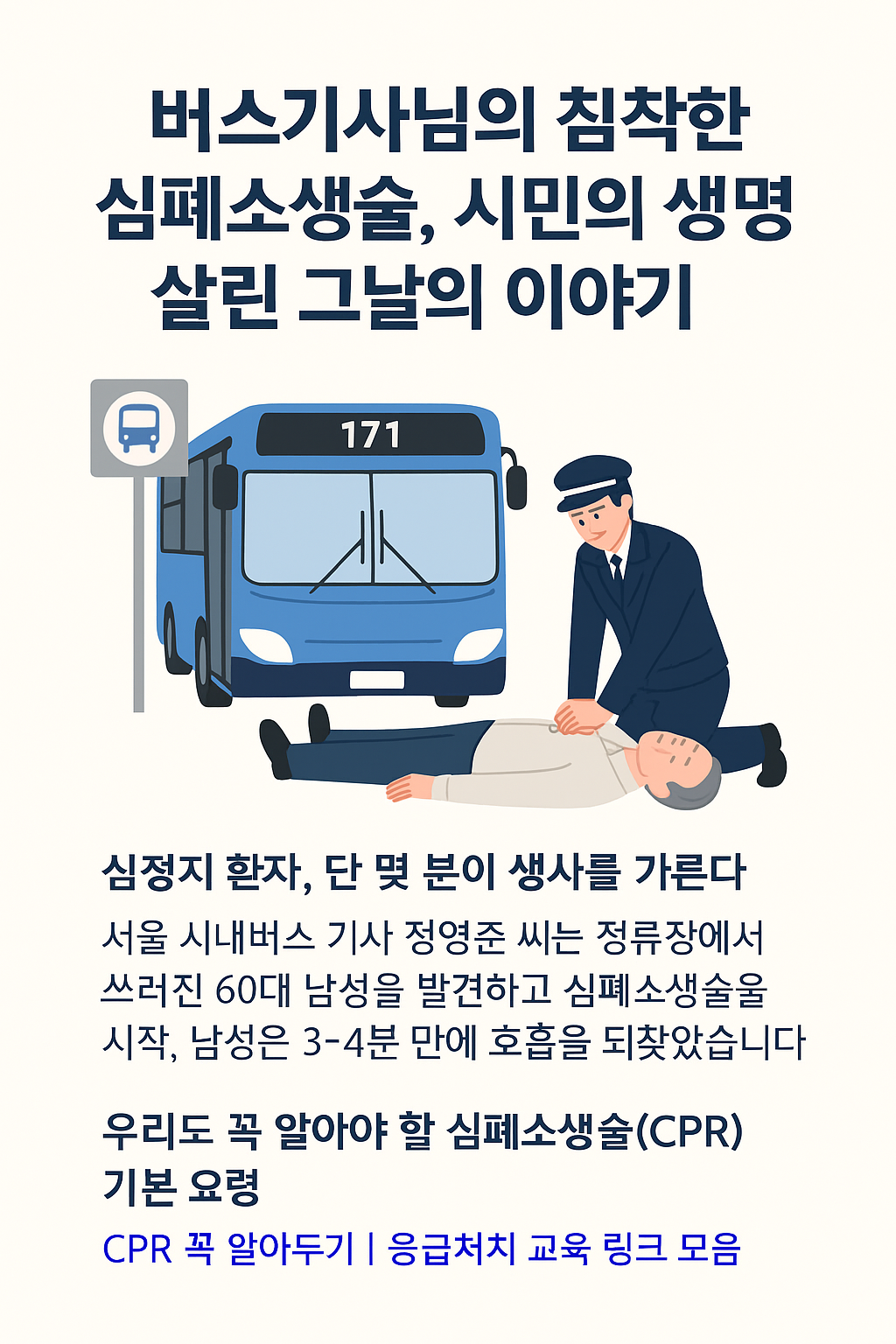 정영준 기사님처럼 CPR 교육을 매년 받고 있다면 더할 나위 없지만, 우리도 기본만 알아두면 충분히 대비할 수 있어요.
